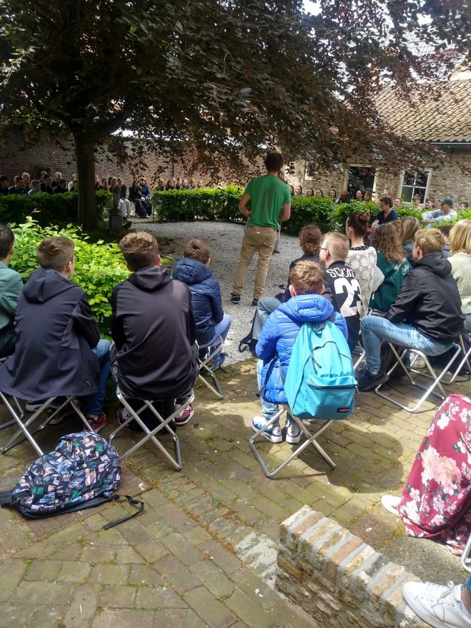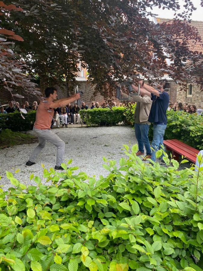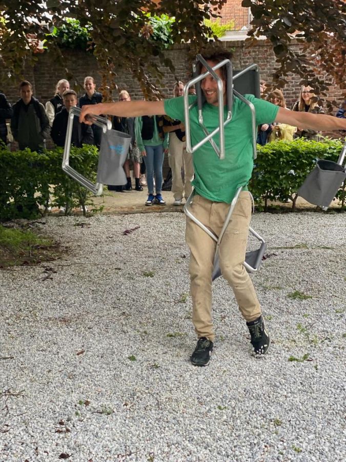 CineLive haalde 2 Belgische straatartiesten van Be Flat naar Hulst om een rondgang te maken met de scholieren van de praktijkschool Hulst. De rondleiding begon in de achtertuin van het Museum Hulst. Zij lieten zien wat je allemaal met klapstoeltjes oftewel plooistoeltjes kan doen. Een ware happening!
